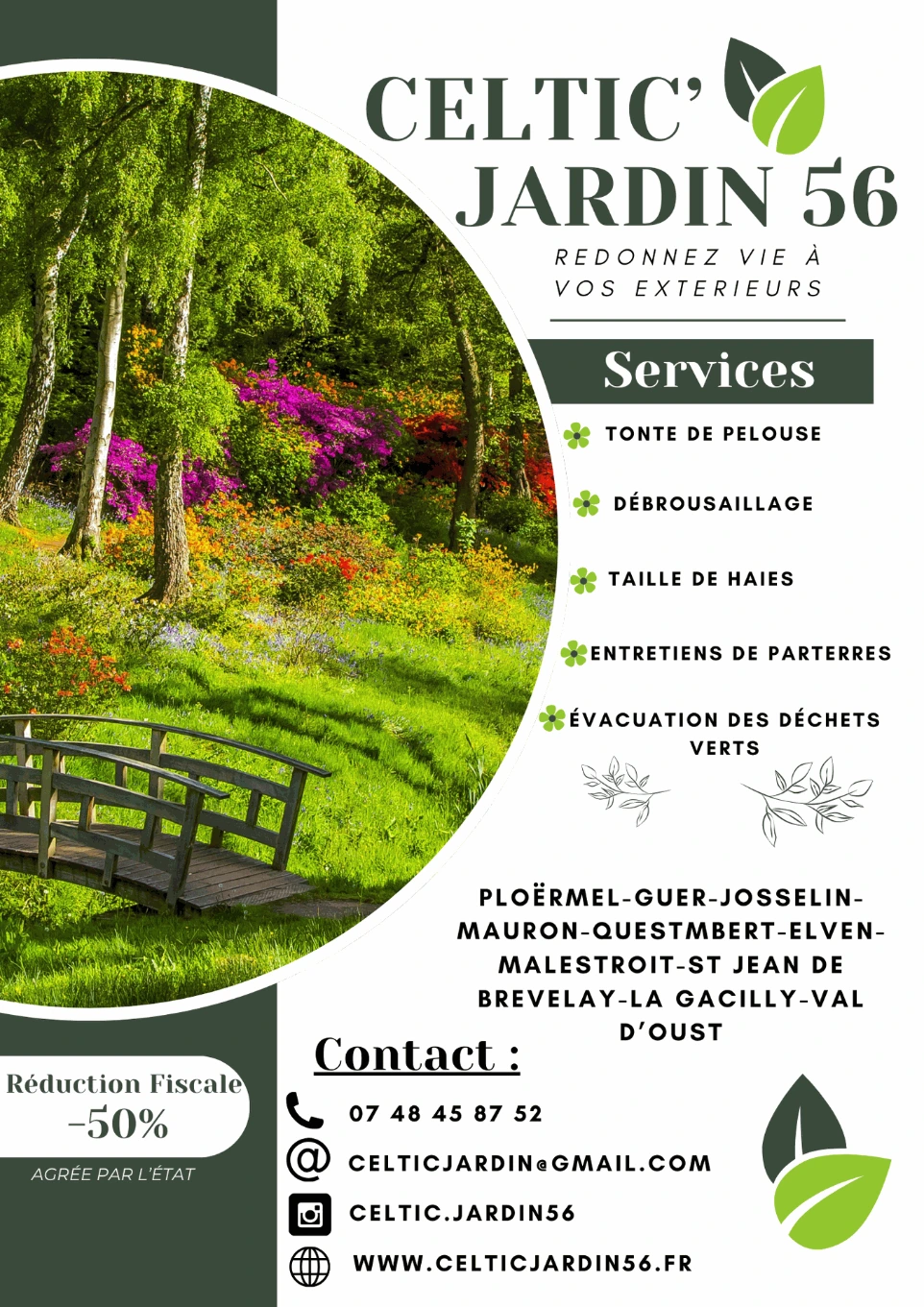 Spécialiste de l’entretien d’espaces verts, Celtic Jardin 56 vous propose des prestations de tonte, taille de haies, désherbage et remise en état de jardin. Profitez d’un crédit d’impôt de 50% sur vos travaux de jardinage. Sur le secteur de Ploërmel, Malestroit, Josselin, Guer et leurs alentours.
